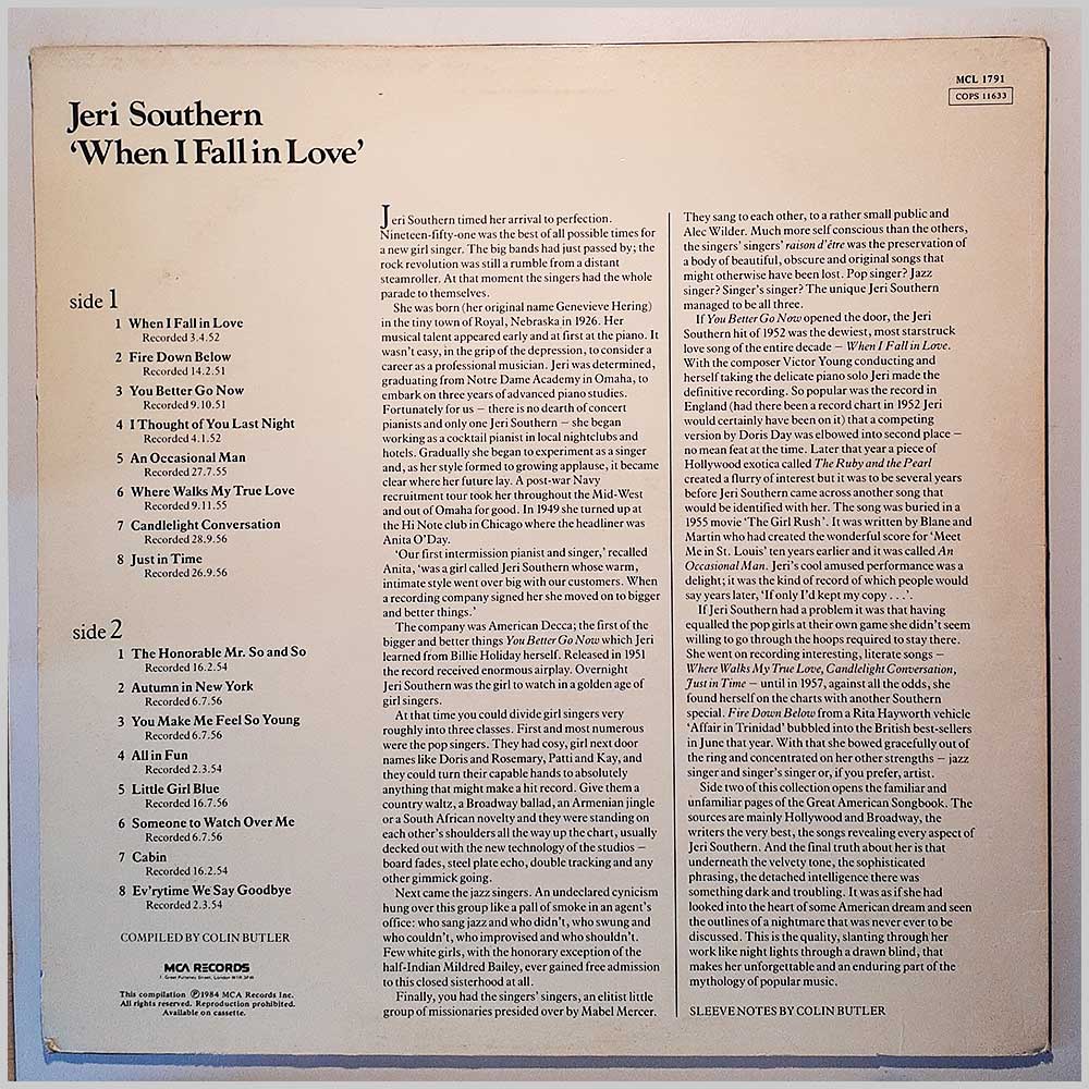 Format: Vinyl Record LP, MCA Records. UK release from 1984. Jazz music vinyl record LP release from Jeri Southern. Classic Jazz Vocal music LP.We are currently away. You can still browse our stock, but cannot place an order. We will re-open mid-February 2026 or sooner. Thanks for your patience!
